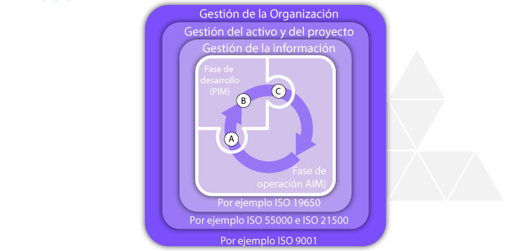 Legend: A Start of the development phase-transfer of relevant information from the AIM to the PIM B Progressive development of the initial design model in the virtual construction model _C End of the development phase- Transfer of relevant information from the PIM to the AIM_Simplified extract of the diagram the UNE-EN ISO 19650-1 standard These transition phases A and C are key points of the process.