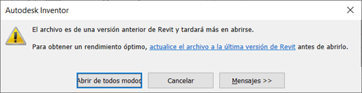 If the Revit file is not version 2021, a message like this will appear:
